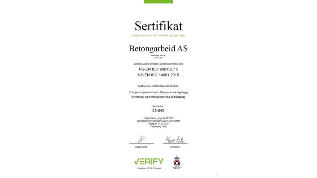 Betongarbeid er ISO sertifisert 9001:2015 Kvalitet og ISO serifisert 14001.2015 på miljø
